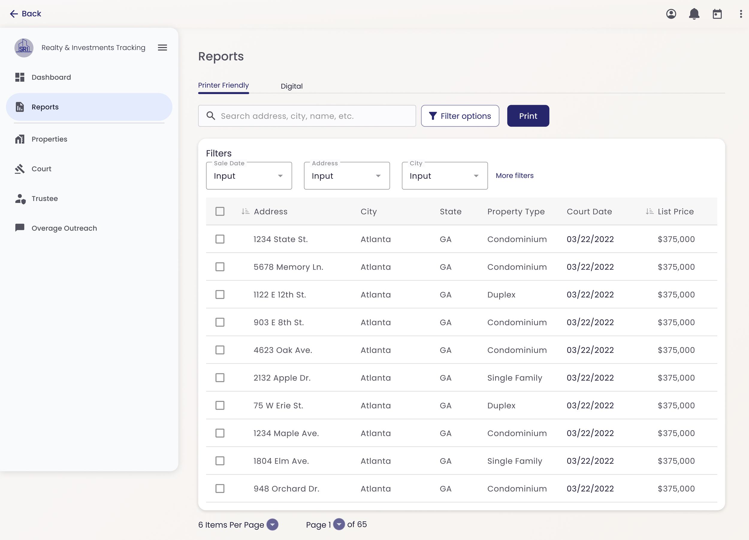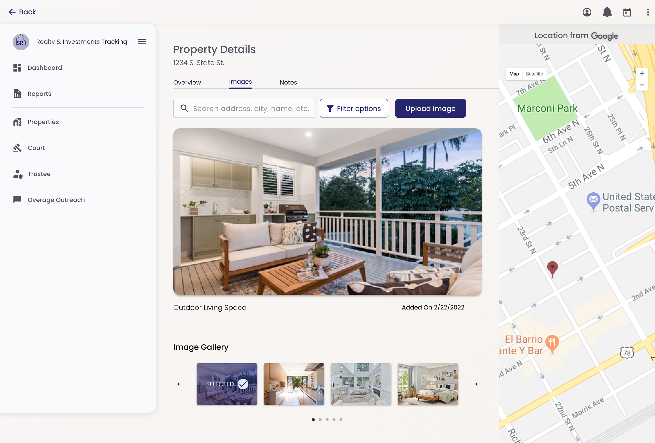 View properties in list, image, and map formats from most granular to least detail. Cards display easily identifiable images of the property to help with recollection. Map out your investments through to ensure properties fall into appropriate regions for zoning and diversification purposes. address and sale price.