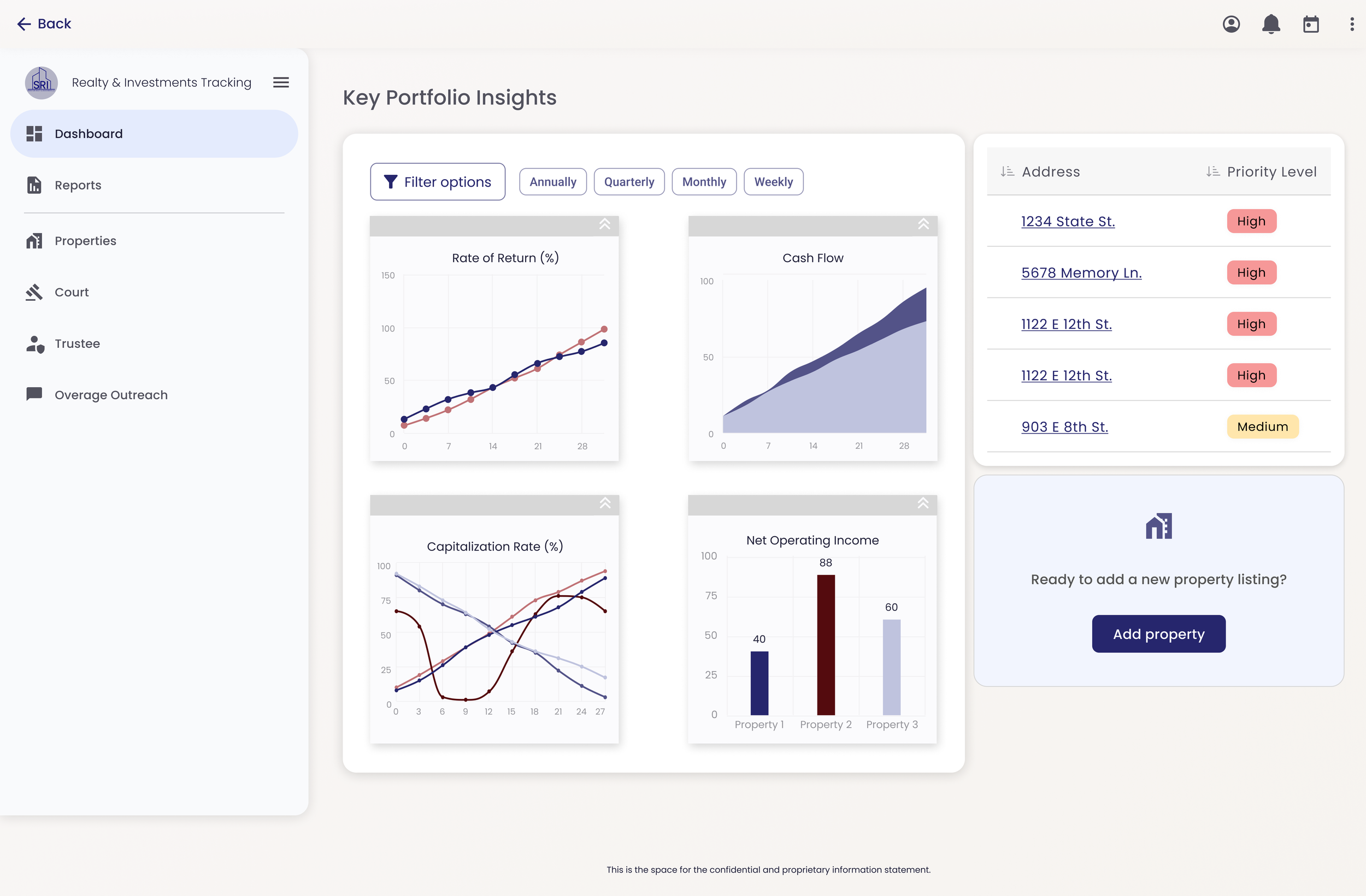 I designed dashboards, view properties view, property details, and reporting pages to provide the team with an MVP design to facilitate decision-making processes on what to implement for development.